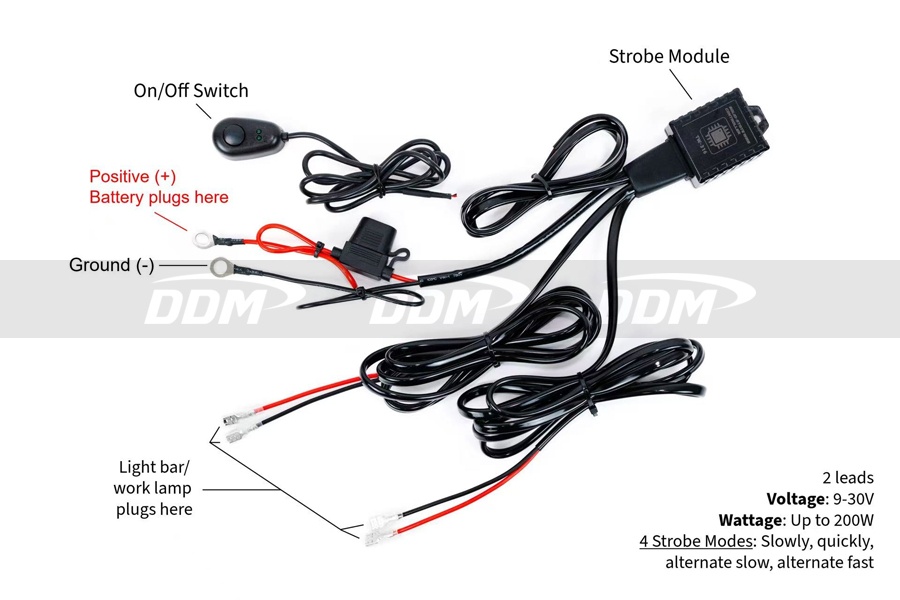Easy to install with two leads, this harness powers your auxiliary LEDs up to 200 watts. It features a full range voltage input from 9 to 30 volts and includes an on/off switch and four strobe options to make your lighting stand out. Supports one or two work lamps or LED light bars.
